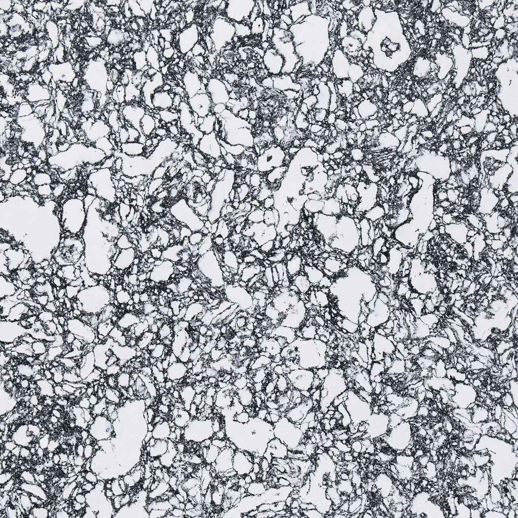 A white foundation is infused with robust black marble veining, creating a striking abstract effect where opposites definitely attract.